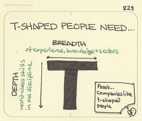 Here’s where Josh points us to the direction of a book titled Range: While Generalists Triumph in a Specialist World, where author David Epstein makes a compelling case that specialists fall behind generalists over time, and that the highest performing people in sports, business, and the arts are always increasing their depth and range at the same time. They specialize, but only after they have done many things and learned how the world fits together. And these professionals are widely known as T-shaped people!